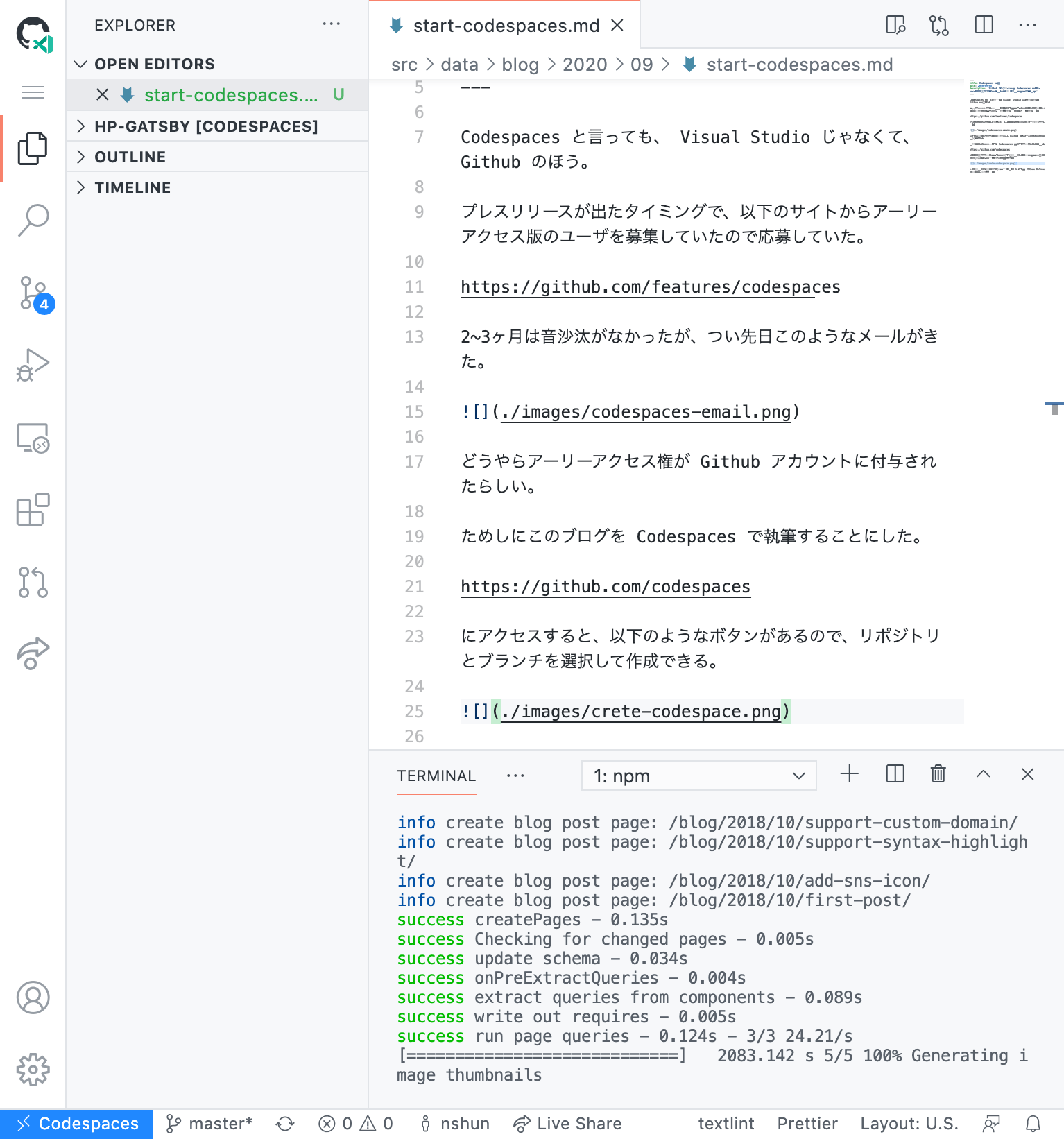作成ボタンを押してから、だいたい 1~2分で VSCode Online の画面が出てきた。